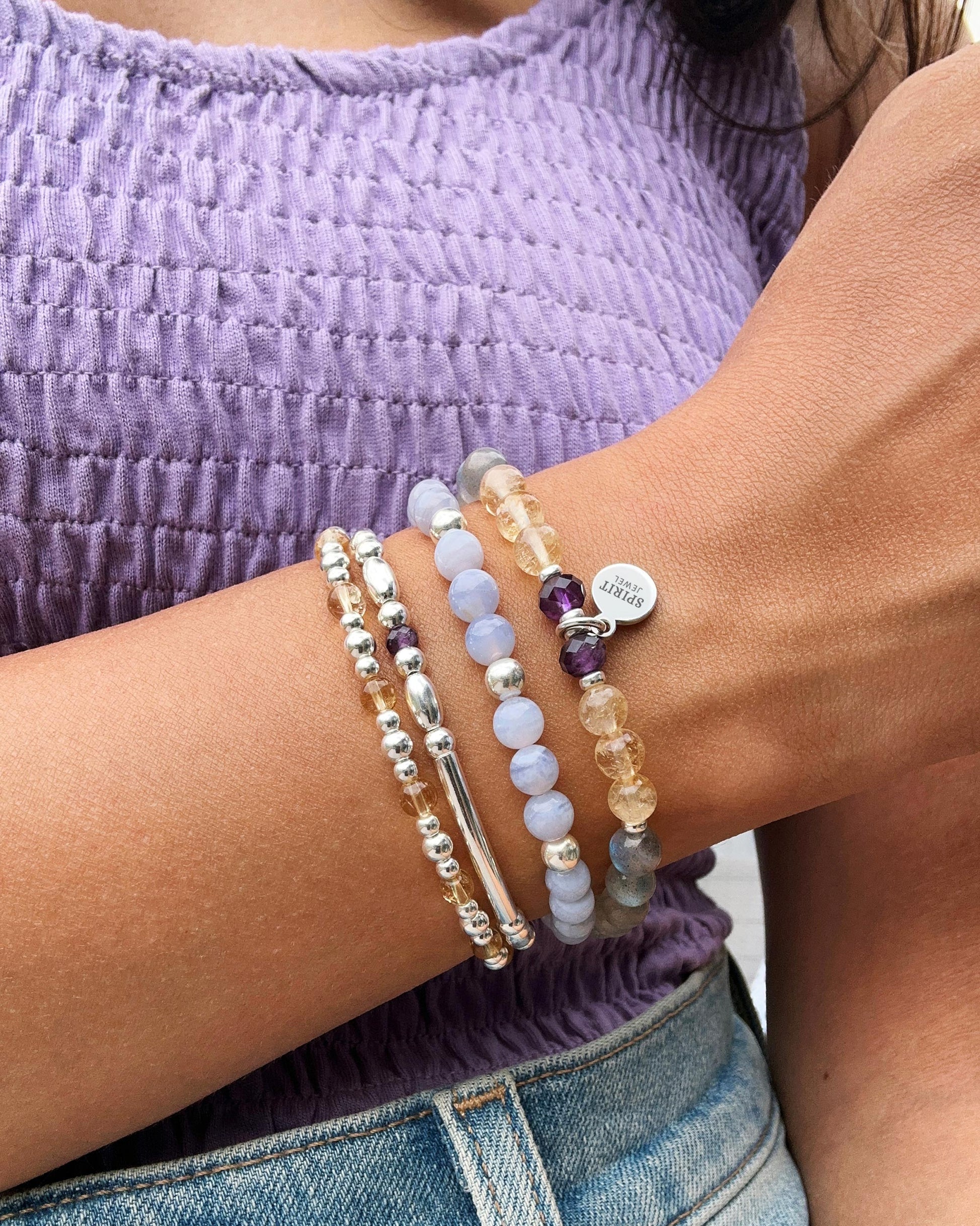 Our anxiety healing bracelet features a powerful combination of anxiety crystals that will support and uplift you during times of fear, insecurity and pain. We’ve chosen Rutilated Quartz and Amethyst gemstones to induce calm, help take the edge off worries and to help with anxiety. Whilst mystical Labradorite and dreamy Blue Lace Agate are here to shield you from negativity and assist with self-expression. This healing bracelet will help you to feel more empowered every day.