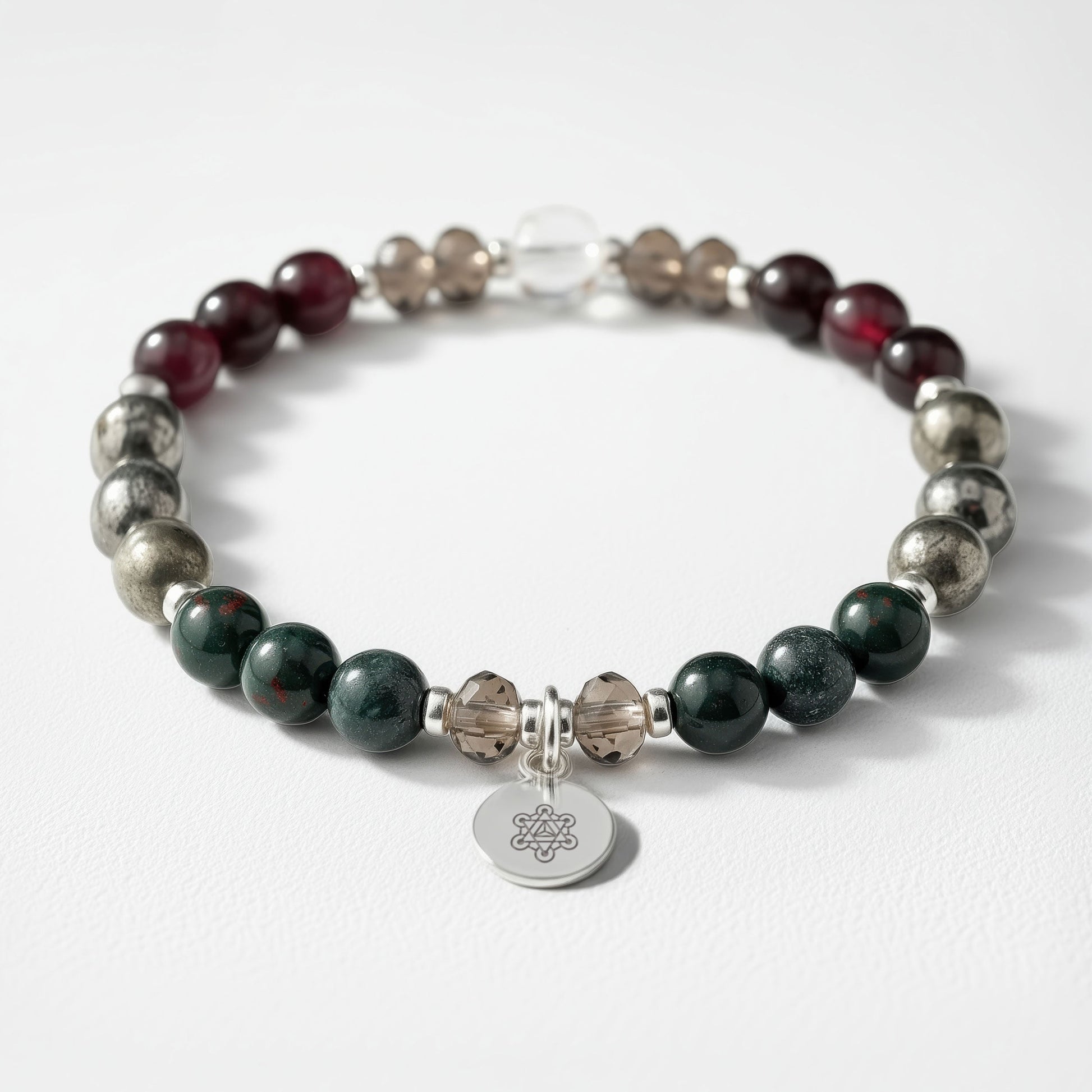 Wearing a healing bracelet such as our Good Health crystal bracelet will help to cleanse your body, restore vitality and promote good health. We’ve chosen a combination of powerful crystals that will work together to protect against negative energy, detox the body and strengthen your whole body and energetic field. Pyrite, Bloodstone, Smoky Quartz and Garnet, along with our Power Crystal, Clear Quartz, will enhance healthy well being and help contribute to a healthier lifestyle. Wear one of our health bracelets to boost your overall health and vitality!