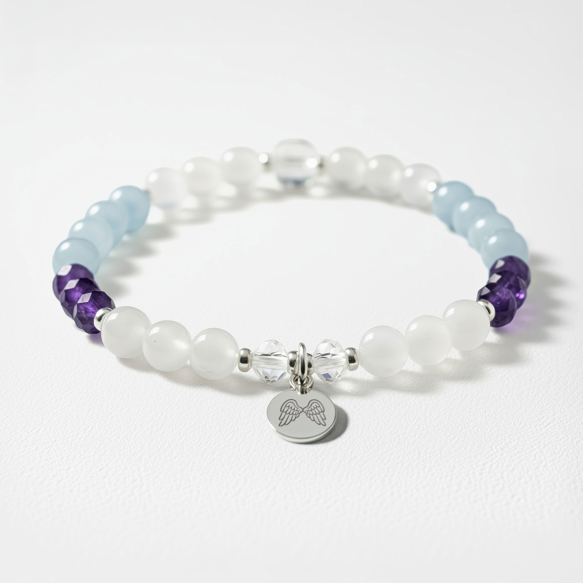 We’ve put together five high vibration angelic stones in this serene Guardian Angel Bracelet to support you in your spiritual development and connection to higher consciousness. Wearing our angel jewellery will stimulate clairvoyance and enhance your intuition, allowing you to clearly receive answers, messages and guidance from the angels. We’ve chosen a blend of Moonstone, Angelite, Amethyst and Selenite gemstones in this healing bracelet, combined with our Power Crystal, Clear Quartz, to attune your vibration, heighten your energy and help you to feel more connected than ever!