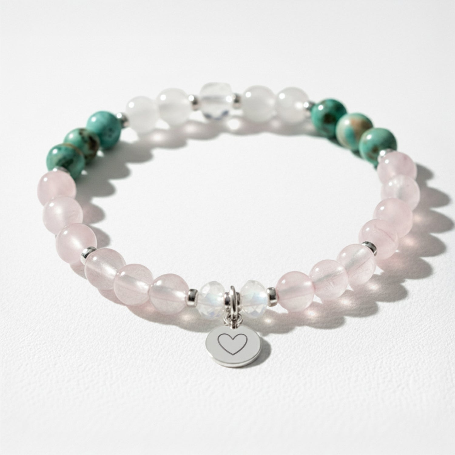 This loving crystal healing bracelet will strengthen unconditional love and inner strength. Perfect for enhancing your own self-love or supporting you with attracting romantic love and healthy relationships, these love crystals offer a high vibration that restores balance, increases joy and opens the Heart Chakra. Created with 5 different crystals for love, the powerful combination of Rose Quartz, Morganite, Chrysocolla and Lavender Amethyst will help to heal painful heartache and work with your energy field to enhance the vibration of love.