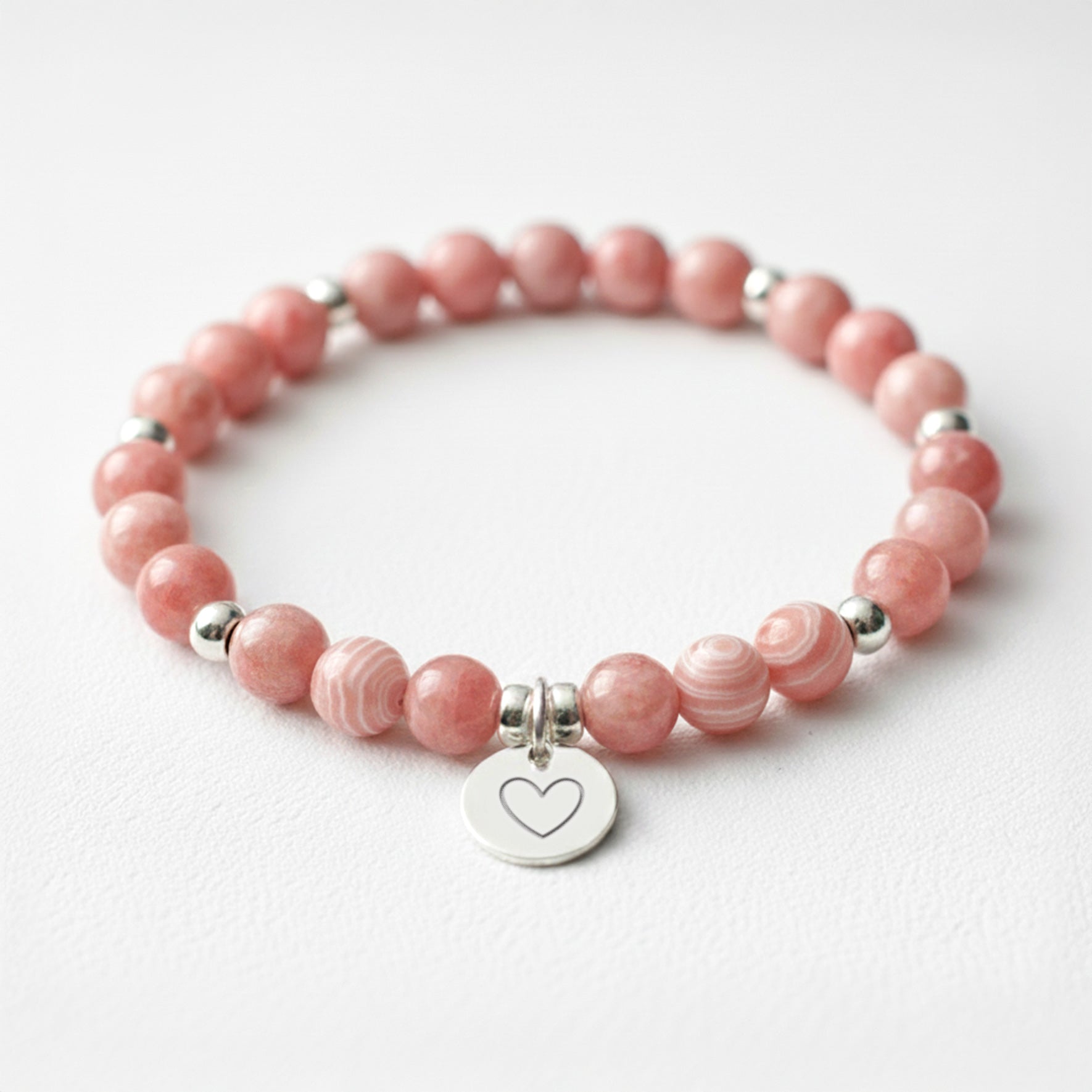 Our silver Rhodochrosite Crystal Bracelet is a beautiful and radiant accessory that captivates the heart with its hues of soft pinks and vibrant rose-red tones. This gemstone is like a gentle whisper of love and compassion, evoking a sense of tenderness and emotional healing. Its appearance often features intricate patterns and bands, creating a visual tapestry that mirrors the complexity of our own emotions.